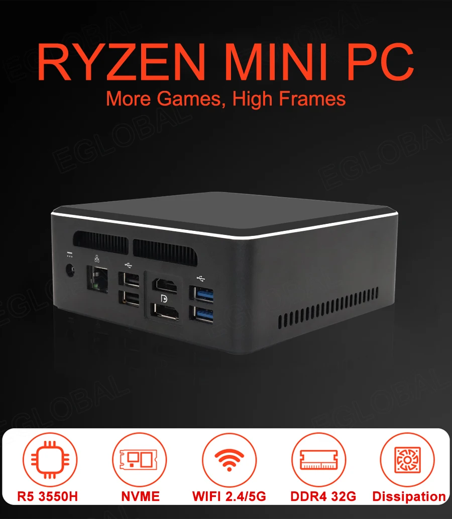 | AMD Ryzen 7 2700 R5 3550H 2500U Eglobal Mini PC with Vega 8 Graphic 4K UHD DP HDMI Type-C Gaming Computer Desktop Nvme SSD |