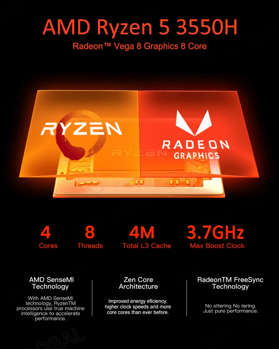 Big Sale for the all bundle in our EGLOBAL OFFICIAL STORE:2. 14nm AMD Ryzen 3 2200U 2 cores 4 threads 2.5GHz up to 3.4GHz 4MB cache TDP 15W Radeon™ Vega 3 Graphics 3 Core 1100MHz3. 12nmAMD Ryzen 5 3550H 4 cores 8 threads 2.1GHz up to 3.7GHz 4MB cache TDP 35W Radeon™ Vega 8 Graphics 8 Core 1200MHz.4. 14nm AMD Ryzen 7 2700U(Pro)4 cores 8 threads 2.2GHz up to 3.8GHz 4MB cache TDP 15W Radeon™ Vega 10 Graphics 10 Core 1300MHz.Product Highlight