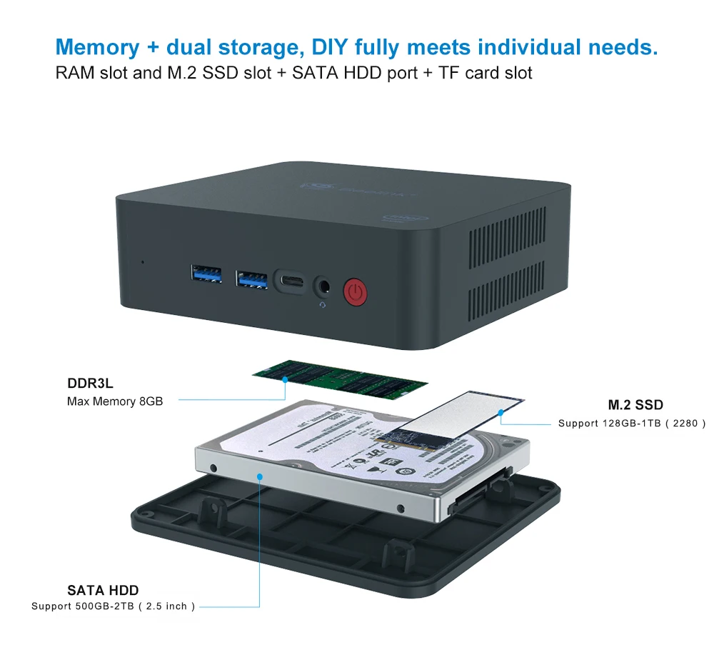 Support 128GB - 1TB M.2SSD/ 500GB - 2TB 2.5 inchHDD/64GB TF cardexpansion