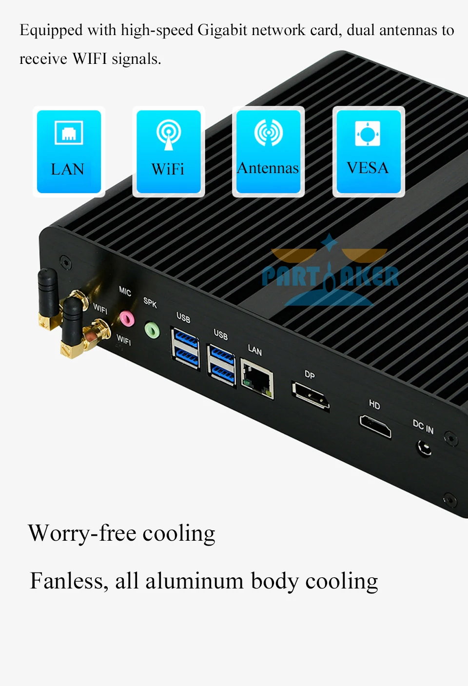 7. Wireless Network: 1*PCI-e for half size wireless network card, 300M 2.4/5Ghz dual band Wi-Fi built-in module, dual external antennas enhanced signal 802.11.b/g/n