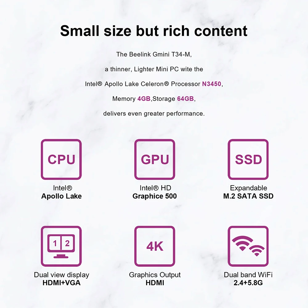 | Beelink T34-M Intel N3450 Windows 10 Mini Pc 6GB 128GB 2.4G 5G Wifi Bluetooth 4K Media Player VGA Portable Computer PC BOX |