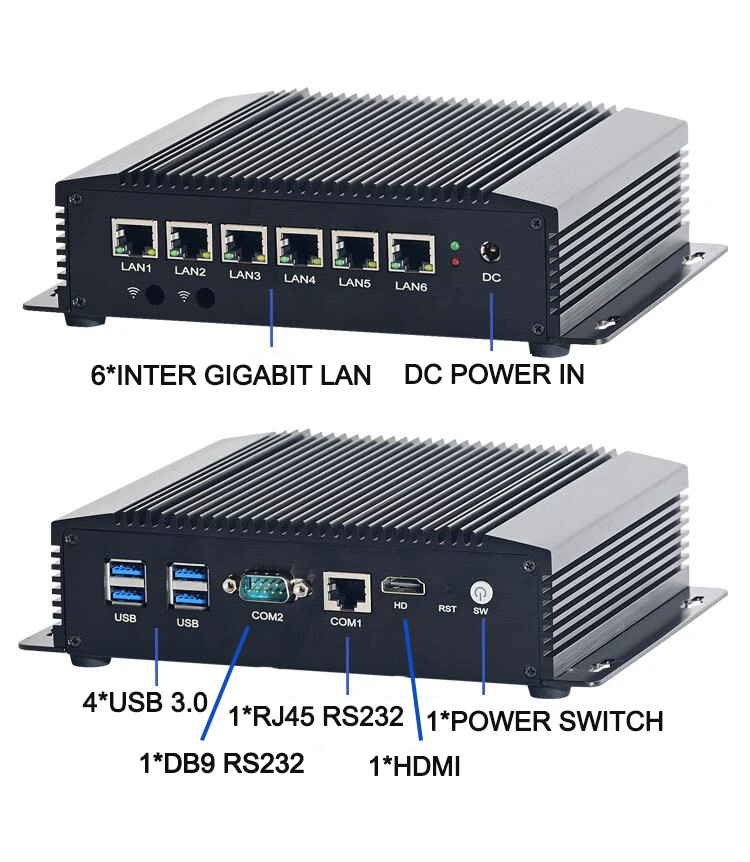 - 6*Intel i201/i211 Gigabit RJ45 LANs and 2*RS232 COM ports, support Windows, Linux and pfSense OS.