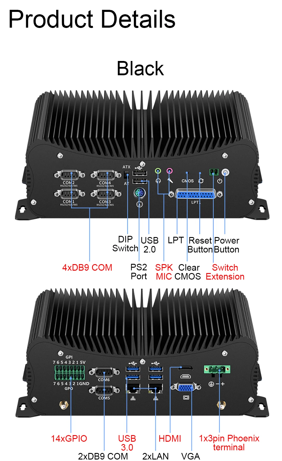 - High-end performance Intel Core i5-7267U/8250U Proceessors Inside;- 2x DDR4 memory slots, enabling you add two memory, max support 16GBx2;- Support three storage, 1x mSATA SSD, 1x 2.5inch SATA, and 1x M.2 2280 SSD ( PCIe type, support NVMe );- 6*RS232, 4 of them can be adjusted to RS422 or RS485 in BIOS;- 2*Gigabit Ethernet, 4*USB3.0, 2*USB2.0, 1x LTP, 1x PS/2, 1x MIC, 1x SPK;- 3pin phoenix power supply connector, support a wide voltage from DC 9V to 36V;- Besides the power button, mini pc with extra 1x 2pin power switch, and mini PC support ATX/AT model switch;- Support watch dog, wake up on LAN, automatically power on aftre power restore;- OS support Windows 10, Windows 8, Linux, WES7/8 and more;- Aluminum case, fanless passive cooling, offering you noiseless experience;- Wireless WiFiAbout Shipping