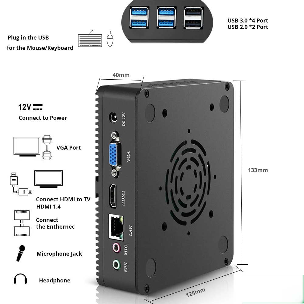 OS Support : Official Windows 10/8/7 (32bit/64bit) Linux XBMC Ubuntu Openelec etc Language Support : English, Russian, Spanish, Portuguese, French, German, Italian, Turkish, Greek etc Ethernet port: Realtek RTL8111E 100/1000Mbps Gigabit Ethernet Wireless wifi: 802.11.b/g/n Video port: 1x HDMI 1.4, 1x VGA USB port: 4x USB 3.0, 2x USB 2.0 X30 PC Dimension: 134×124×35 mm Cooling System: Fanless Processors Performance: