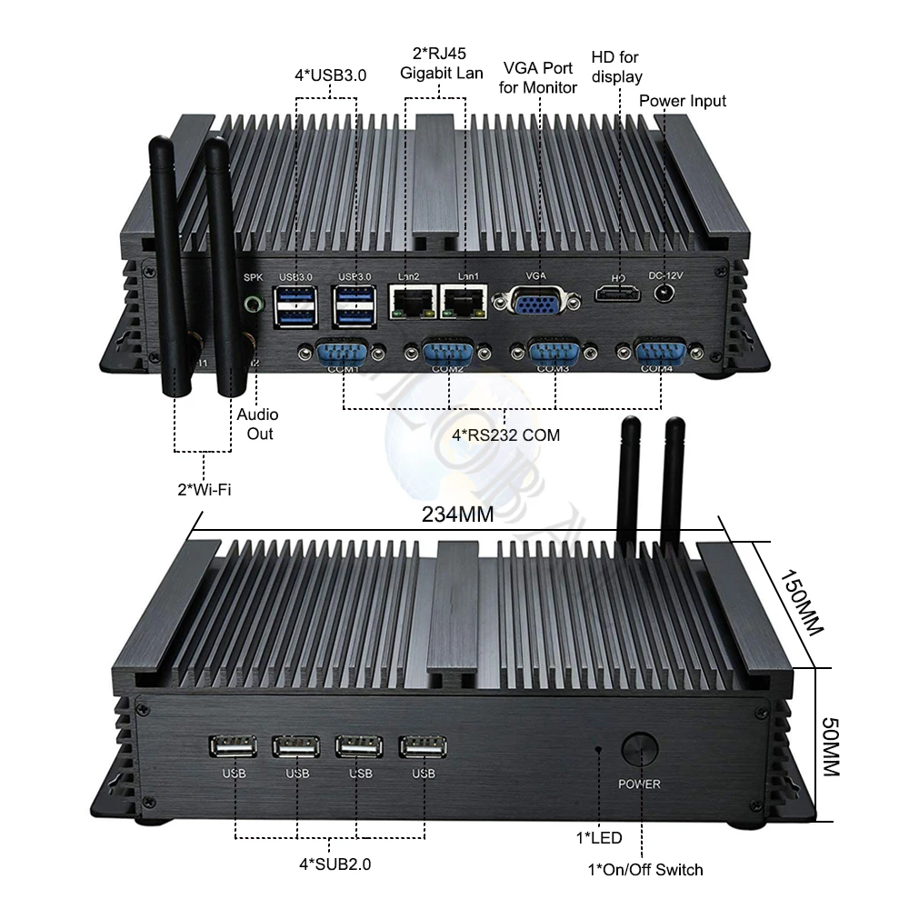 - Dual RJ45 Gigabit LAN and 4 RS232 COM ports fit for industrial field.