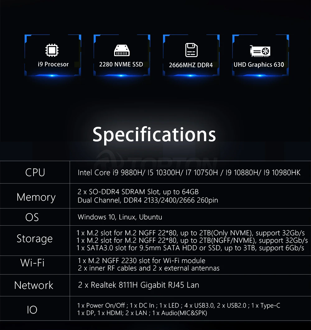 | TOPTON Mini PC Windows 10 Intel i9 9880H 8 Core 16 Threads 2*DDR4 2*M.2 NVME 2*Lan Barebone System DP HDMI HTPC NUC 4K Computer |