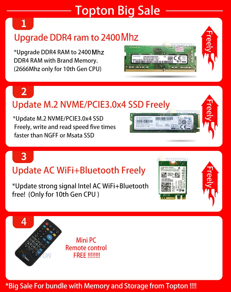 1. USB Infrared remote (can turn power off but not on) add extra cost US$14. Best Price Comparison With TOPTON Gaming Mini PC Intel Core i9 9980HK i7 9750H i5 9300H Nvidia GTX 1650 4GB 2*DDR4 64GB Windows 10 4K DP HDMI AC WiFi