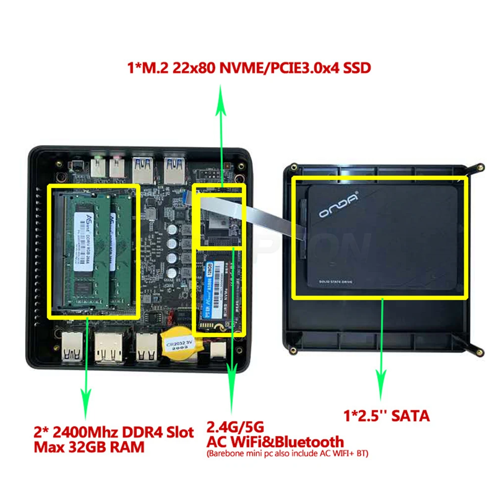 Memory: 2*DDR4 ram slots, max 32GB 2400MHz Storage: 1*M.2 22x80 NVME/PCIE3.0x4 SSD+1*2.5'' SATA Graphic card: Radeon™ Vega 8 Graphics 8 Core Video ports: 1*HDMI 2.0, 1*DP, 1*Type-C, support 3x4K@60Hz display, support HDR Network card: Support RJ45 10/100M/1000M+2.4G/5G AC WiFi&Bluetooth Function: SenseMI Technology/FreeSync Technology/Wake on lan/ PXE/Auto restart when lost power USB: 3*USB3.0+2*USB2.0+1*Type-C USB 3.1 Heat-sink: Turbo cooler Power Supply: 19V/3.42A Color: Black What's in the package 1xMini PC 1xPower supply 1xPower cable ( we ship correct power plug base on buyer's address ) 1xSATA power&data cable 1xUser Manual All bundles on sale includes WiFi. PC had best to use Samsung, SKhynix, Micron etc original brand accessories, We DO NOT compensate for buyer's own ram and hard drive. Free Operating System: Default installed our trial activated OEM windows 10 pro English for free, other languages can be selected among: Russian,Spanish,Portuguese,French,German,Arabic,Italian,Japanese,Turkish,Greek etc. Please inform us which language you want to install. Other systems we can install free are like Linux, XBMC(Kodi), Ubuntu, Openelec etc if you need. Seller is irresponsible and makes no compensation for function of OEM system. Accessories as Ram, SSD, HDD, we use famous brand:samsung, micron, SanDisk, toshiba, hynix, crucial, liteon, kingfast, phison etc, What brand we use depends on our test and our stock. 2. External USB DVD-ROM add extra cost $18. 3. USB 2.4GHz Air Keyboard& Mouse, add extra cost $20. 4. Genuine license sticker add extra cost 35$. 5. 500GB 2.5'' HDD add extra 50$, 1TB 2.5'' HDD add extra 65$, 2TB 2.5'' HDD add extra 100$. Uprading link: https://www.aliexpress.com/item/4000259902487.html (How many dollars to upgrade, pay how many pieces, US$1=1pcs, For example upgrade USB IR remote, pay 14pcs for US$14, remember to leave message noting which one you upgrade for...)