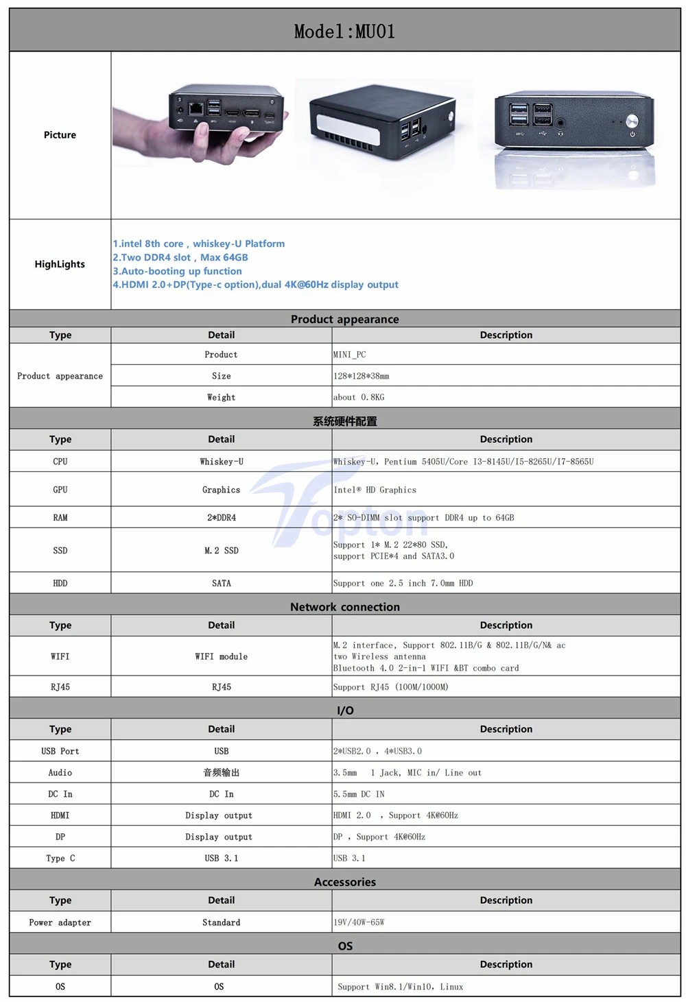 3. Support 1*M.2 PCIE*4/SATA3.0 SSD(22x80)+1*2.5'' 7mm SATA HDD/SSD
