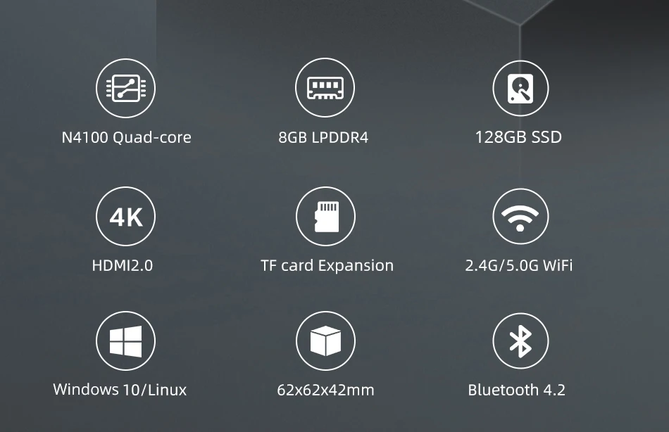 | Pocket Mini PC Intel Celeron N4100 8GB LPDDR4 128GB SSD Windows 10 2.4G/5.0G WiFi Bluetooth 4.2 HDMI 2.0 4K 60Hz Type-C 2xUSB3.0 |