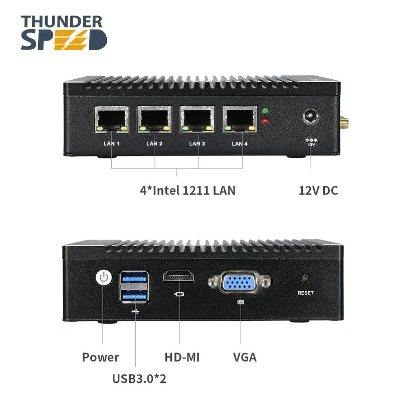 Size: 135x125x30mm Gross Weight: 1.5KG Onboard CPU: Intel Celeron Processor N2940 Quad-Core 2M Cache,1.83GHz, up to 2.25GHz Memory: 1xDDR3L SO-DIMM Socket,1333MHz, Support up to 8GB Memory" Storage: 1xMini-PCIE Msata, Support up to 256G SSDProcessor Graphics: Intel Atom Processor Z3700 Series, 311-854MHz LAN: 4 x Intel I211-AT- 10/100/1000 Controller Audio: Realtek ALC662 HD Audio Wifi: Optional Power Consumption: 7.5W Front-Panel Connectors • Power on/off• 2 x USB 3.0• 1 x HDMI• 1 x VGABack-Panel Connectors • 1 × DV 12V input• 4 x RJ45 Ports• 2 x Antenna PortsOperating System: Default Pfsense, Support Win7/8/10, Linux etc.About Shipping