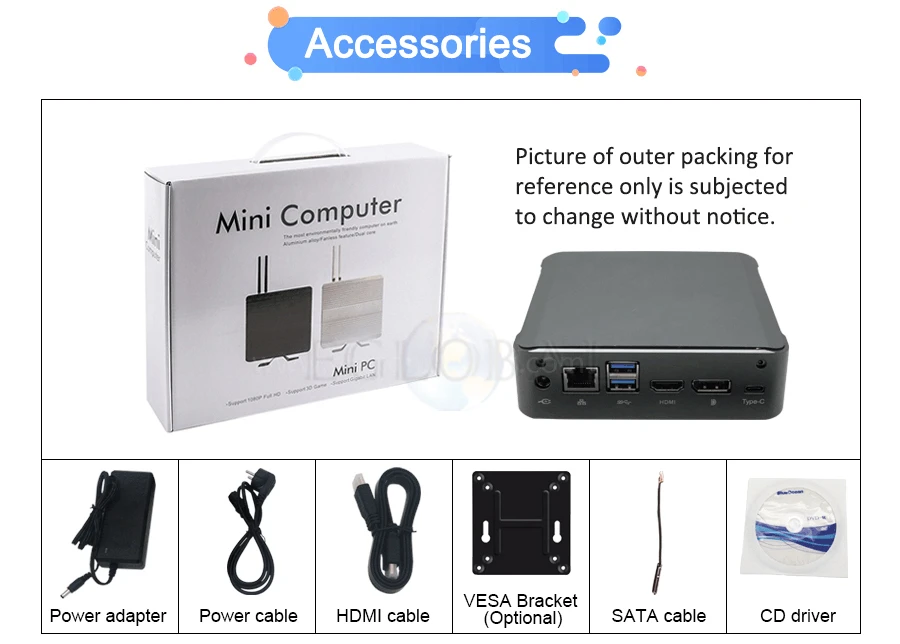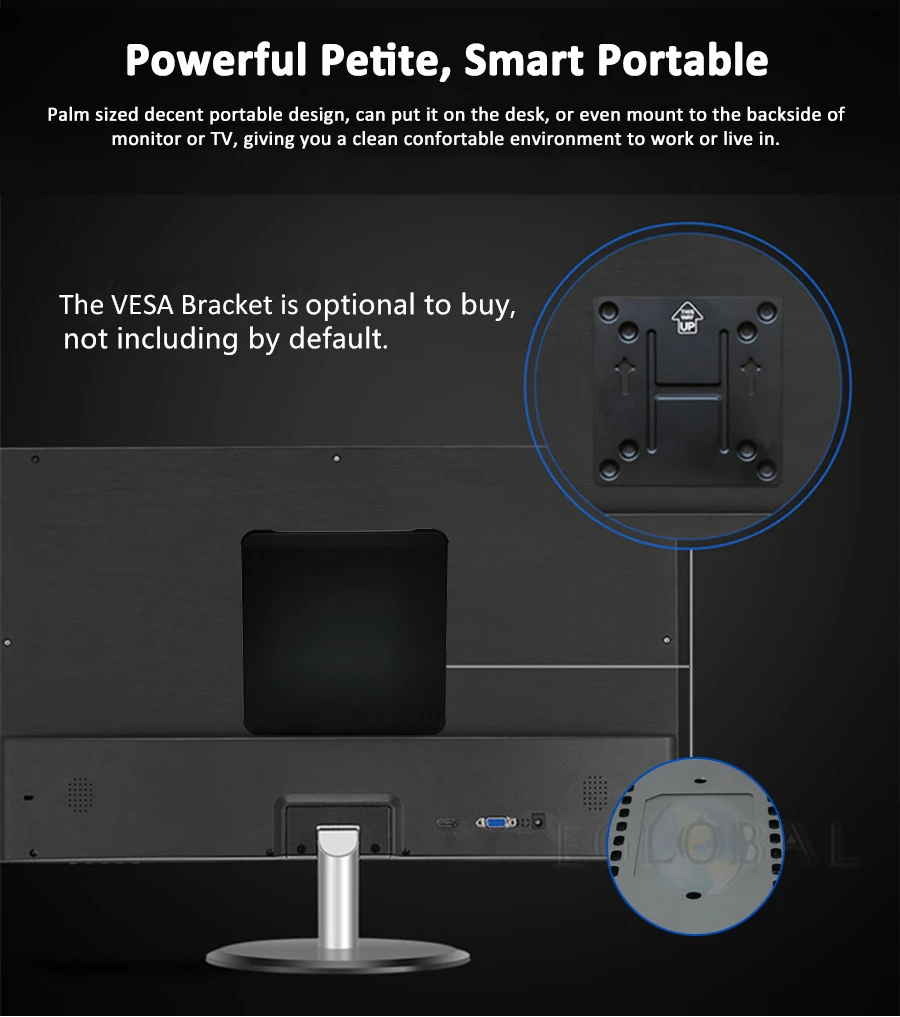 7. Silent Copper Fan as heatsink for 7*24 hours stable performance All bundles on sale include WiFi. DO NOT buy "no ram no storage" bundle if you are not Computer Expert, PC had best to use Samsung, SKhynix, Micron etc original brand accessories, We DO NOT compensate for buyer's own ram and hard drive. 1. VESA bracket for mounting back of monitor add extra cost $5. 2. External USB DVD-ROM add extra cost $18. 3. USB 2.4GHz Air Keyboard& Mouse, add extra cost $20. 4. Genuine license sticker add extra cost 35$ 5. 500GB 2.5'' HDD add extra 50$, 1TB 2.5'' HDD add extra 65$, 2TB 2.5'' HDD add extra 100$. Upgrading link: https://www.aliexpress.com/item/765856572.html (How many dollars to upgrade, pay how many pieces, US$1=1pcs, For example upgrade VESA bracket, pay 5pcs for US$5, remember to leave message noting which one you upgrade for...) Free Operating System: Default installed our trial activated OEM windows 10 pro English for free, other languages can be selected among: Russian,Spanish,Portuguese,French,German,Arabic,Italian,Japanese,Turkish,Greek etc. Please inform us which language you want to install. Other systems we can install free are like Linux, Ubuntu etc if you need. Seller is irresponsible and makes no compensation for trial OEM system. Accessories as Ram, SSD, HDD, we use famous brand:samsung, micron, SanDisk, toshiba, hynix, crucial, liteon, kingfast, phison etc, What brand we use depends on our test and our stock.